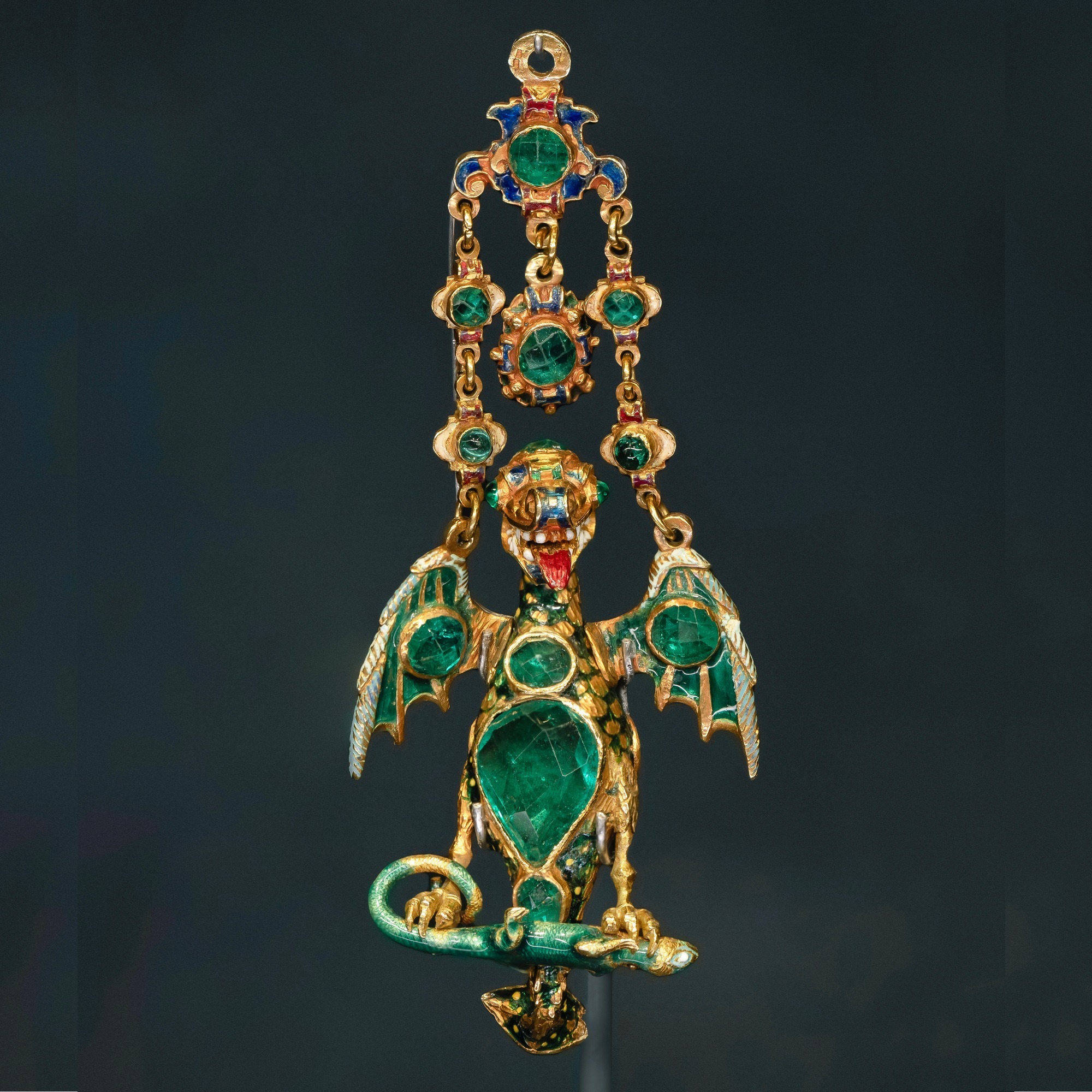 吊坠中带翼龙的形象与15世纪 Paolo Uccello 于圣乔治屠龙画作中所绘的龙十分相似——伸开血盆年夜口的飞龙透露出鲜红而矫捷的舌头,不可一世地支着下颌,扇着一对于巨年夜的蝠翼,一对于健硕的后腿长着利爪。于基督教配景中,通常与圣乔治一同呈现的龙,都被描画为泼辣的绿色魔兽。这件希世作品颇有多是为某位职位地方爱崇的人士订制,按照传播记载曾经属在罗斯柴尔德(Rothschild)家族。